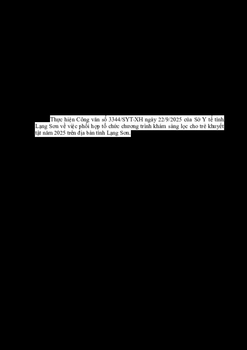 | Tiêu đề văn bản | Công văn về việc phối hợp tổ chức Chương trình khám sàng lọc cho trẻ khuyết tật năm 2025 trên địa bàn xã Yên Phúc | ||