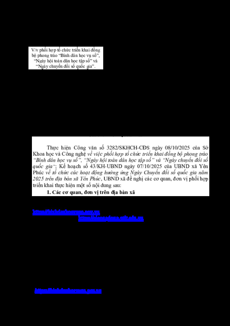 | Tiêu đề văn bản | Công văn V/v phối hợp tổ chức triển khai đồng bộ phòng trào " Bình dân học vụ số" " Ngày hội toàn dân học tập số" và "Ngày chuyển đổi số quốc gia" | ||