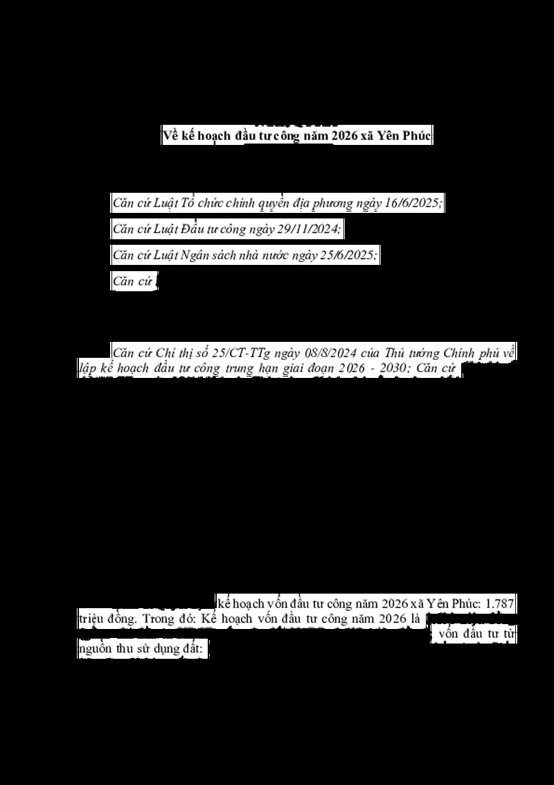 Tiêu đề văn bản Nghị Quyết Về kế hoạch đầu tư công năm 2026 xã Yên Phúc
